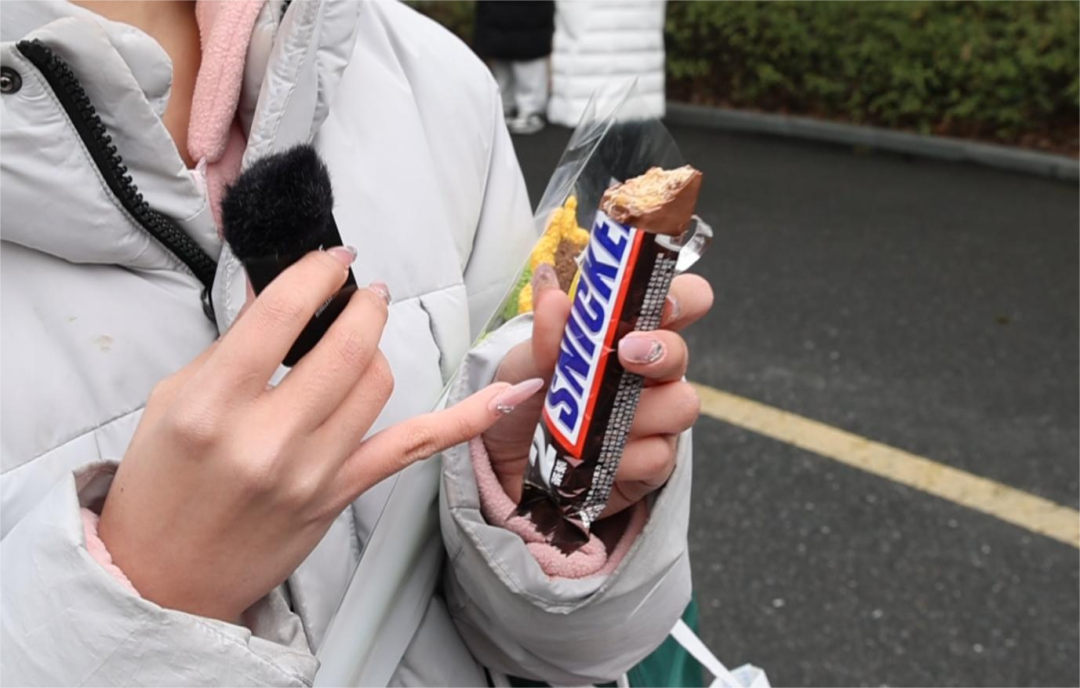在现场,一位考生还向我们介绍了她包里的必备物品——补充能量的巧克力和功能饮料,因为平时常常要很长时间不吃饭,“即使没有力气上课也得挺着,我们后续上课就这样——”,她生动地模仿起饥肠辘辘时上课的状态。
