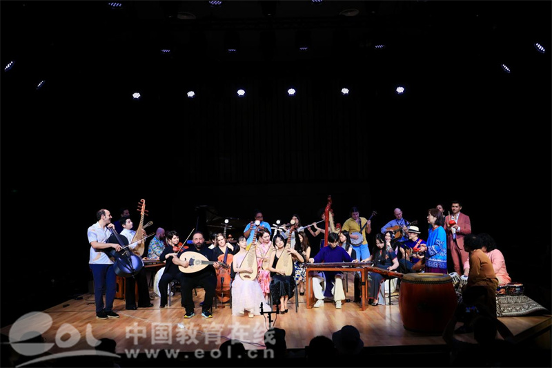 音乐会上,东西方乐器交融,传统与现代碰撞,展现出丝路音乐文化的广阔包容性与创新活力。最后,全体合奏中国民歌《四季调》、美国传统歌曲《Shove the Pig’s Foot a Little Further into the Fire》以及具有浓郁中国特色的《秧歌》。台上台下默契互动,不同文化背景的音乐人因音乐而共鸣,生动诠释了“各美其美、美美与共”的深刻理念。