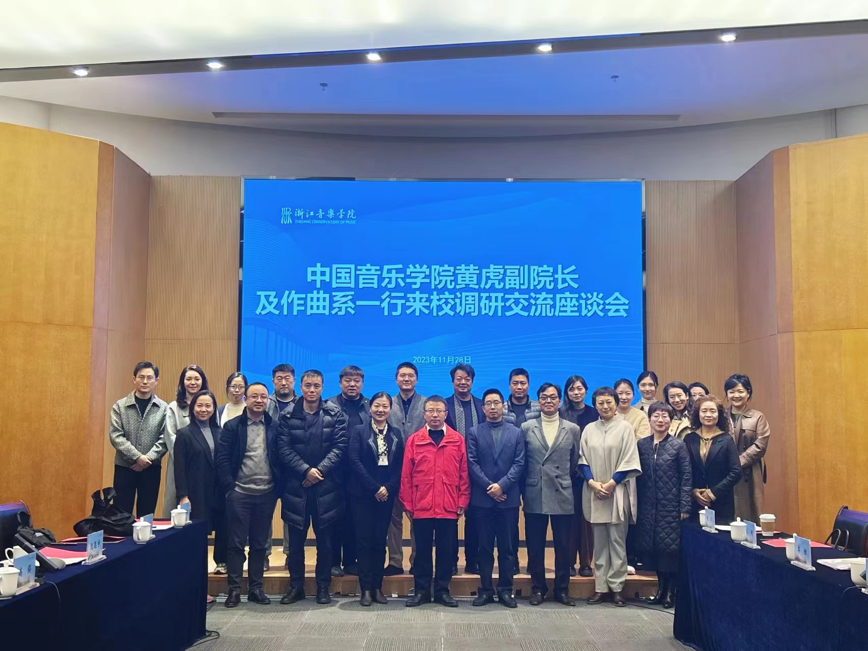 11月28日,中国音乐学院党委常委、副院长黄虎教授,作曲系主任高缨教授等12位教师来我院作曲与指挥系开展交流调研。我院副院长、党委委员汪洋教授,作曲与指挥系主任安承弼,党总支副书记、副主任、招生办主任唐大林,副主任王云飞等12位教师参加了交流会。