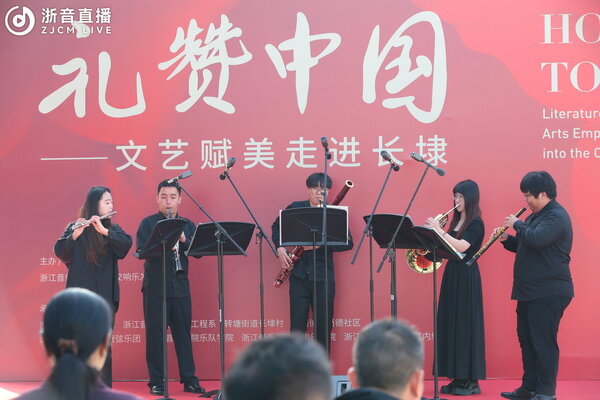 伴随长埭村村民热情的掌声,由张贺中、吉雅图、丁玉璇、李长威四位同学组成的弦乐四重奏率先为大家带来莫扎特最著名的《G大调弦乐小夜曲》,拉开了音乐会的帷幕。活泼流畅的节奏和短促华丽的八分音符颤音组成欢乐的旋律,一出场就点燃了现场的气氛。第二首演奏的是《启航随想曲》,该曲旋律歌唱性强,内涵简单易懂,纯正细腻且扣人心弦,在弦乐四重奏精彩演绎下,让观众在美妙的音乐声中无限遐想。曲风一转,弦乐四重奏带来陕北信天游的代表曲目之一《兰花花》,淳朴生动、犀利有力的演绎,充分展现了不畏社会压迫、敢于为爱情作斗争的坚强女性形象。弦乐四重奏组合以《我和我的祖国》作为结尾,这首耳熟能详的歌曲顿时让在场观众热血沸腾,让大家再次深感身为中国人的自豪与骄傲。