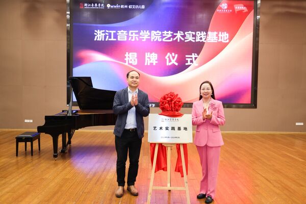 学院与欧文幼儿园签署艺术实践基地共建协议。王均寅、裘菊兰共同为艺术实践基地揭牌。