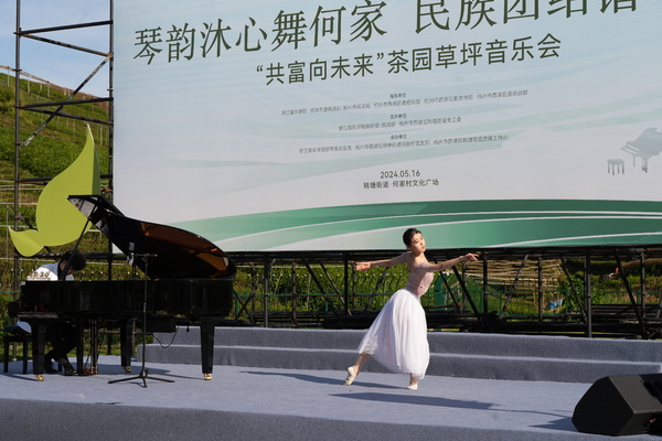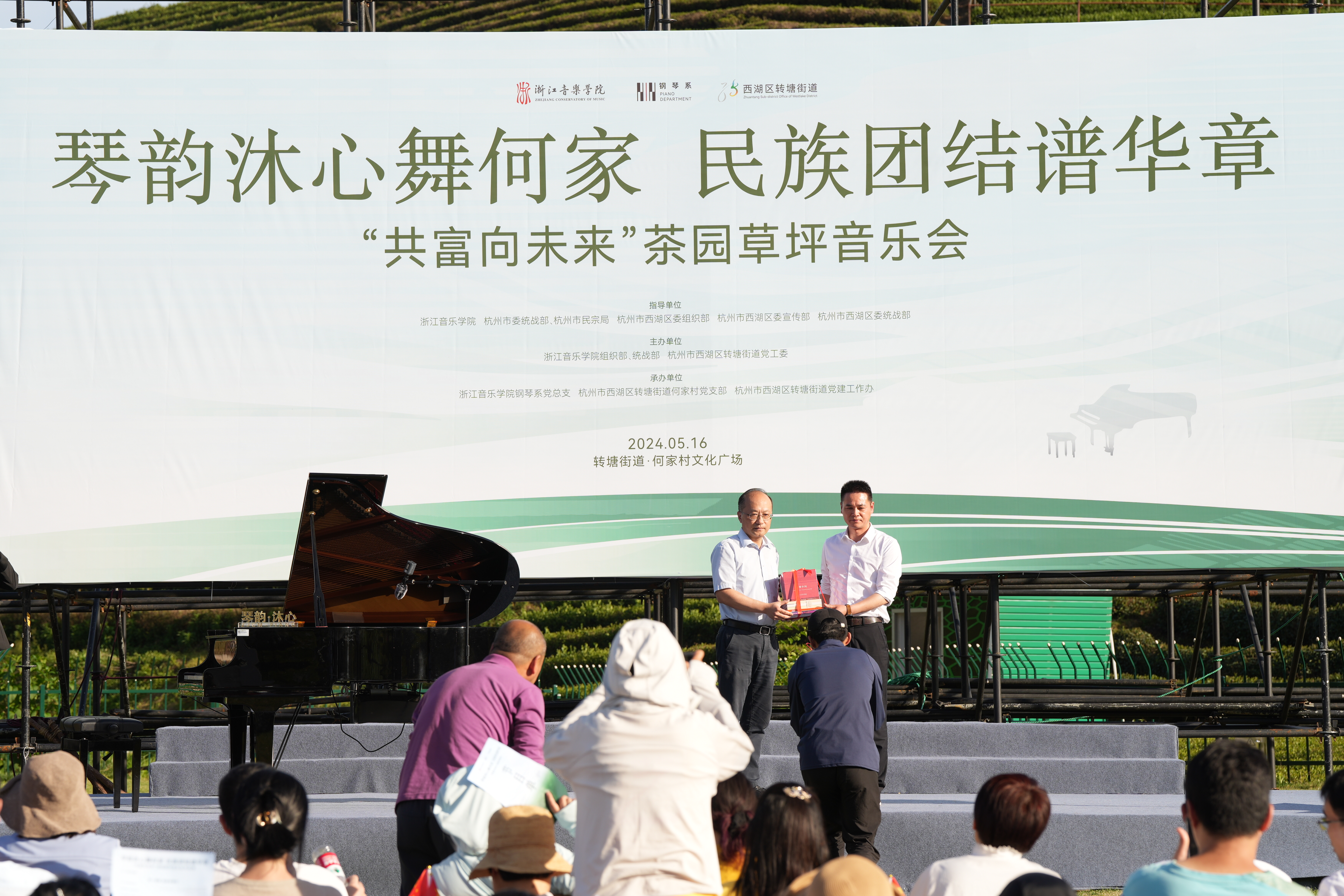 随后,钢琴独奏《中国之梦》、流行演唱《如愿》《稻香》、二胡与钢琴《赛马》、二重唱《阡陌江南》等多首耳熟能详的乐曲相继上演。作为何家村“艺术村长”的刘福洋,也与钢琴系教授陈琼共同演绎了舞蹈与钢琴节目《鸿雁》,并带领村民共舞。转塘街道“石榴红”合唱团也首次亮相,一曲《之江同心石榴红》收获了全场的热烈掌声。最后,音乐会在浙音师生与转塘街道“石榴红”合唱团共同演唱的《我和我的祖国》中落下帷幕。在生机盎然的茶山下、翠绿松软的草坪中,欢乐与音符共振,生动展现了一幅和谐美好的茶乡画卷。