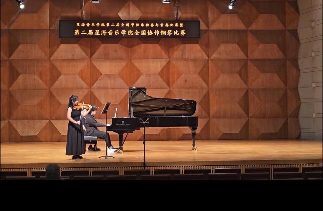 “小提琴和钢琴奏鸣曲是一种经典的室内乐形式,需要学生们不仅熟悉自己声部,而且要对我演奏的部分和总谱非常的熟悉。学生们在和我合作练习之前,他们已经对我的声部有一定的了解,在排练过程中,我们进行了大量沟通,讨论各自的理解和演奏意图。”进入复赛后,室内乐学院特邀管弦系肖航辰老师担任小提琴合作助演,肖航辰也谈到了关于音乐配合与比赛准备的问题:“理解乐曲的情感和风格,通过音乐表达来增强小提琴和钢琴之间的互动和配合也是一个非常重要的部分。以弗兰克《A大调奏鸣曲》为例,这个曲子钢琴部分任务多一些,主旋律多一些,乐句交替和承接部分就很需要情感的统一。我和陈维祯同学在音乐处理上就进行了很多探讨,我们通过歌唱乐句,听大师的演奏版本进行对比,最后统一音乐处理。当然重要的是不断地重复练习,在比赛前的这段时间里,我们逐渐建立起默契,提高了配合的自然度和流畅性,自然地,双方就都更容易倾听对方的演奏,以便及时做出反应和调整。”