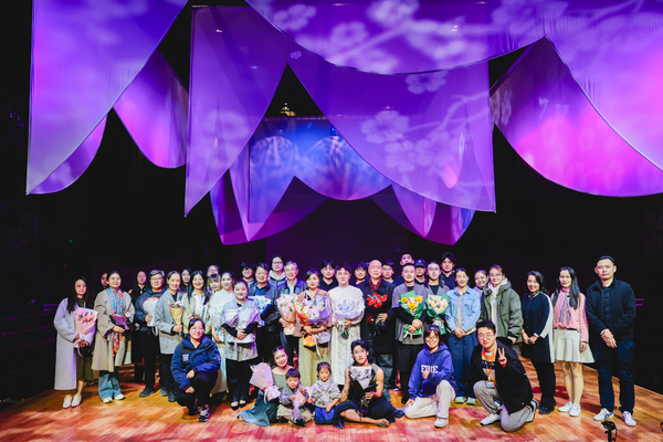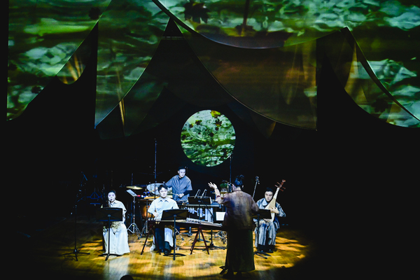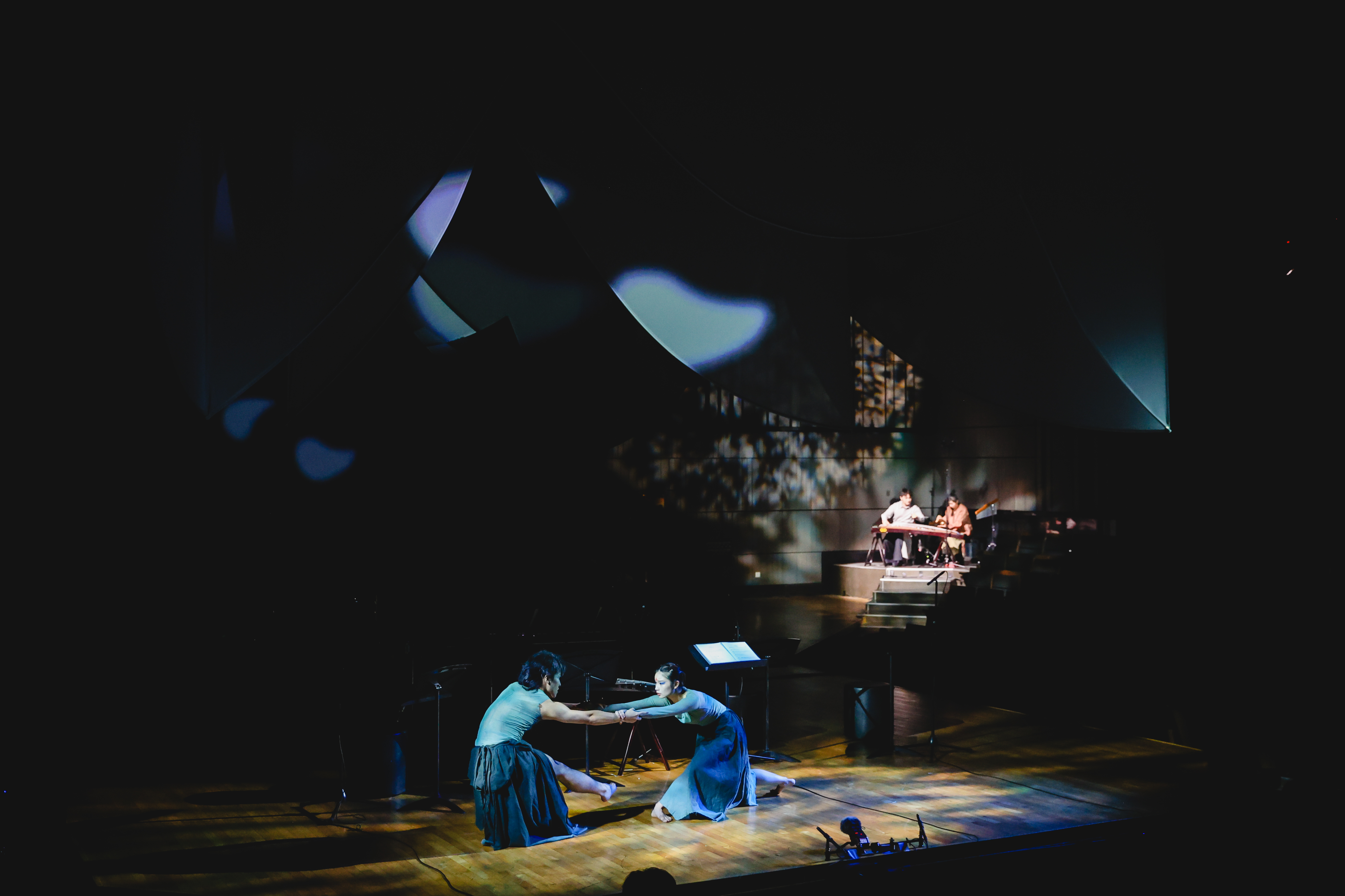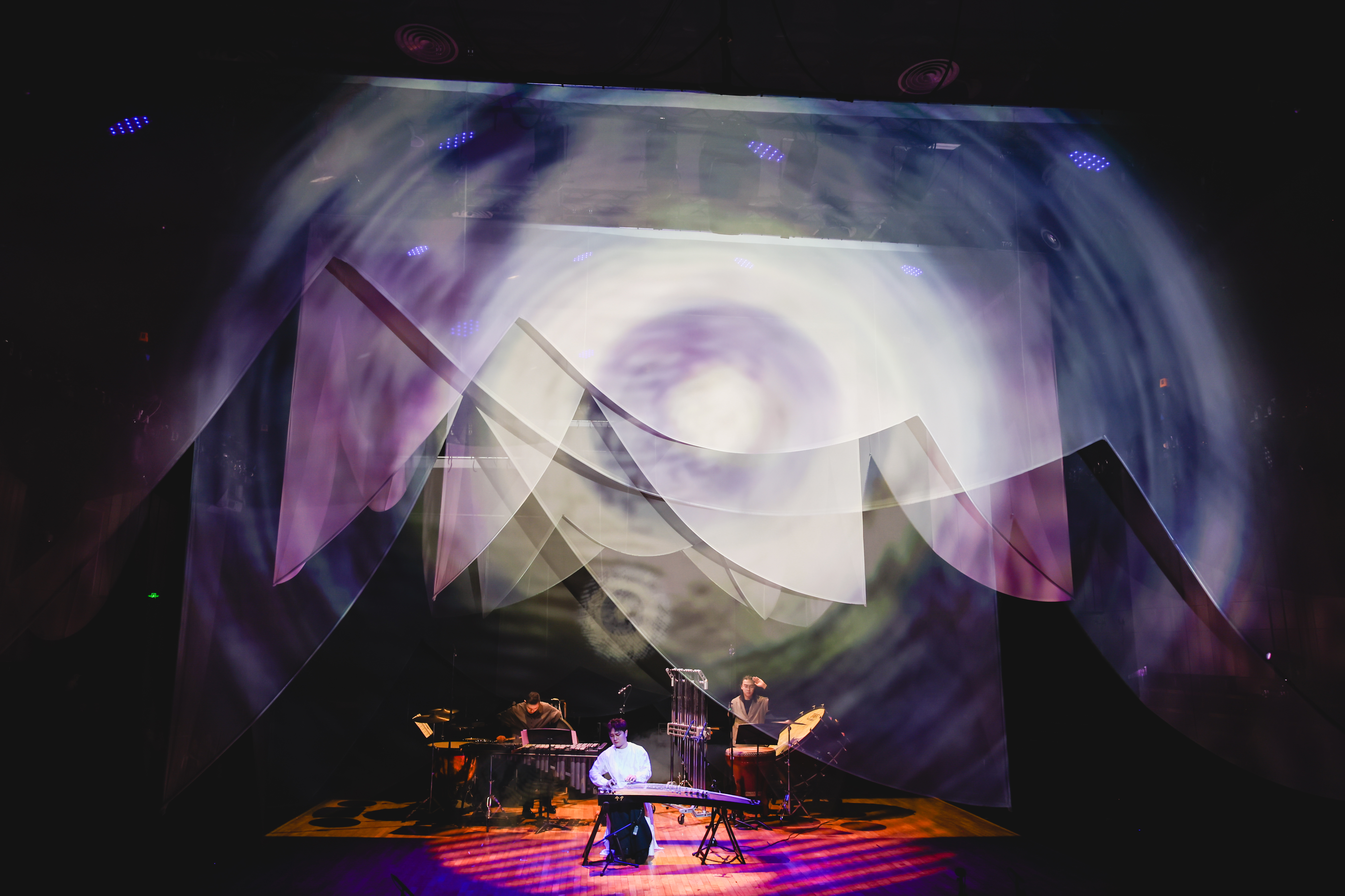 在音乐会的内容上,作曲家专门用诗意的格律感将其分成三个篇章,如一江春水向东流、独寻山间晚来风等,各篇章以演奏家与舞蹈家的即兴对话来叙事展开,整场音乐会在“视、听、动”的共构下,演绎出春去冬来的如梦景象。在这些作品中,象征富春山江四季容颜的《乐之流》《土土虫》《秋池》《幻石》诗画四部曲,通过作曲家独特的“拟态化创作技法”,在中西方乐器的共鸣下,将富春山江与原始自然的神韵,以及作曲家神秘且热烈的人文情愫,用抽象的艺术语言刻画出来。值得一提的是,张昕对音乐语言的娴熟驾驭与创造力,为其音乐创作的即兴表达筑牢根基,她与古筝演奏家刘乐在音乐的即兴演绎中,与舞蹈对话交融、共同生长,这样即时又鲜活的情感表达,让音乐在既定框架下拥有了自由驰骋的空间。在多元艺术的协同下,那潺潺溪流、巍峨山峰、缭绕云雾以及灵动飞鸟仿佛都随着音乐的律动跃然眼前,观众仿若置身富春盛景中,与艺术家们共同体验着自然的神奇、艺术的奇妙。