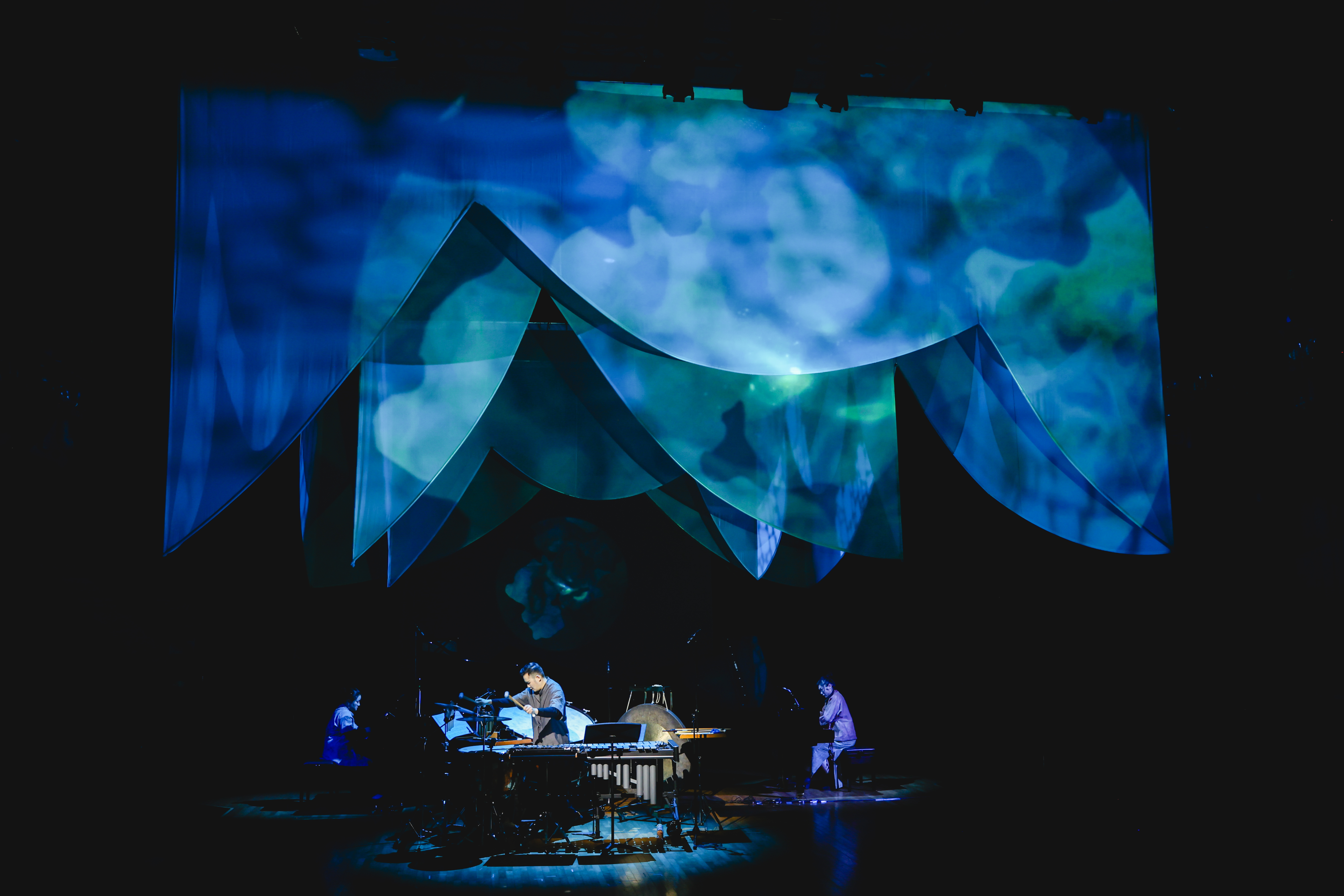 该项目以富春山江的人文景致为灵感来源,融合了视觉艺术与环境舞蹈艺术,用“氛围沉浸式”的音乐剧场形式,将观众带入到充满诗意梦幻的富春音景中。这一艺术形式以当代音乐为主要载体,通过视觉艺术与环境舞蹈的加入,让观众更加身临其境的感受到音乐所要传递出的抽象内容。为达到这一艺术形式的最佳观演体验,在音乐厅有限的造景条件下,导演张昕利用不同剧场独有的空间特点,进行音乐会的视觉形式构建与演员空间调度,既要保证室内乐音响的最佳听感,又要让观众能够完全沉浸在环境舞蹈与即兴演奏所刻画的音乐生景中。也正是因为艺术家们要面临各种极限演出的条件限制,才激发出了他们更大的创造力与表演张力。在这样一个独特沉浸式的艺术场域中,观众们近距离的感受着艺术家们忘我的精彩演绎与情感释放,与他们的身体律动与音响的能量汇聚交流,完全沉醉在这如梦如幻的富春山江诗画音景中。