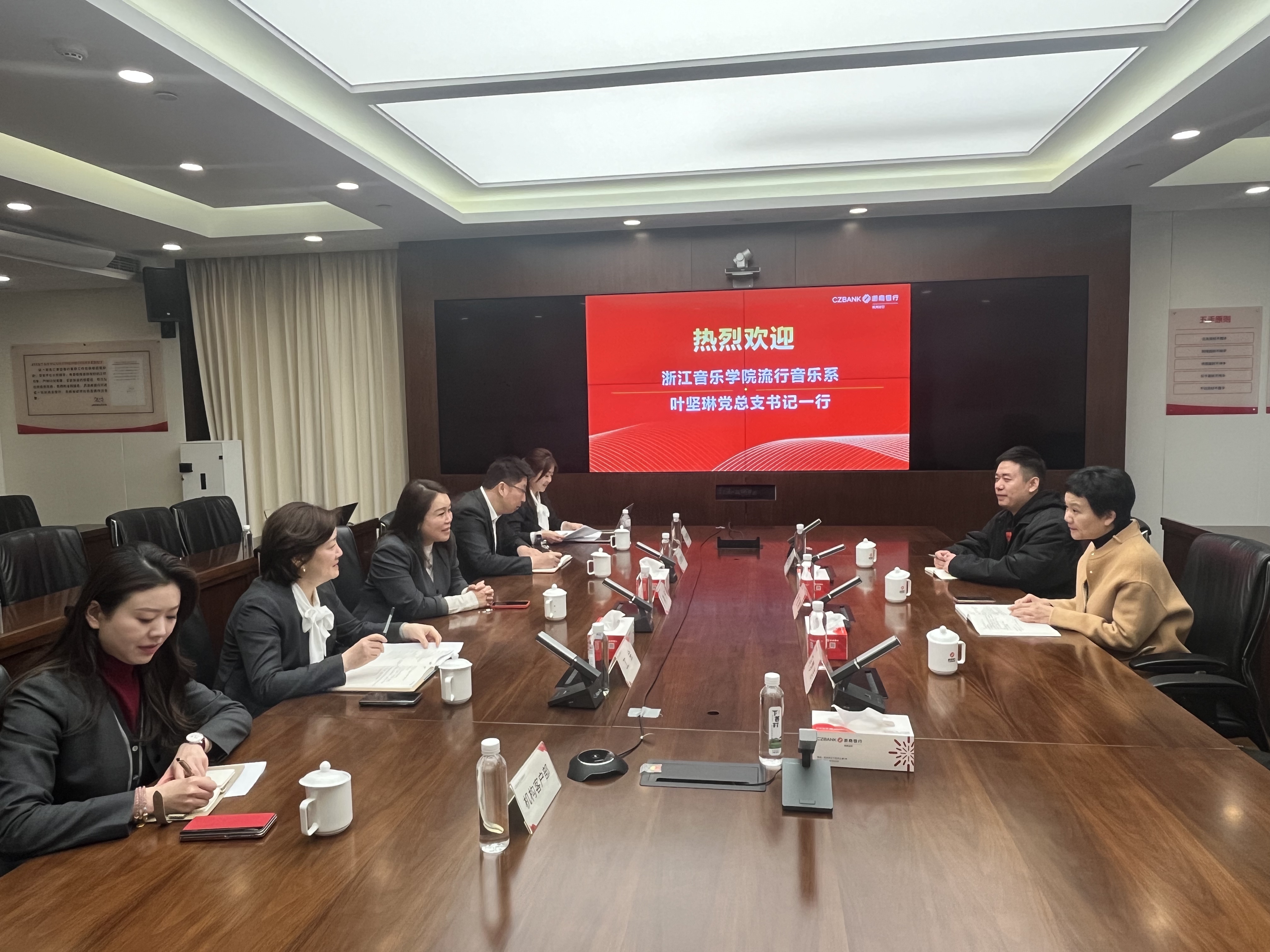 为深化推进产教融合,切实做好访企拓岗促就业专项行动,3月5日上午,流行音乐系党总支书记叶坚琳、副主任张正元和学生党支部书记冯梦洁一行赴浙商银行杭州分行走访交流。