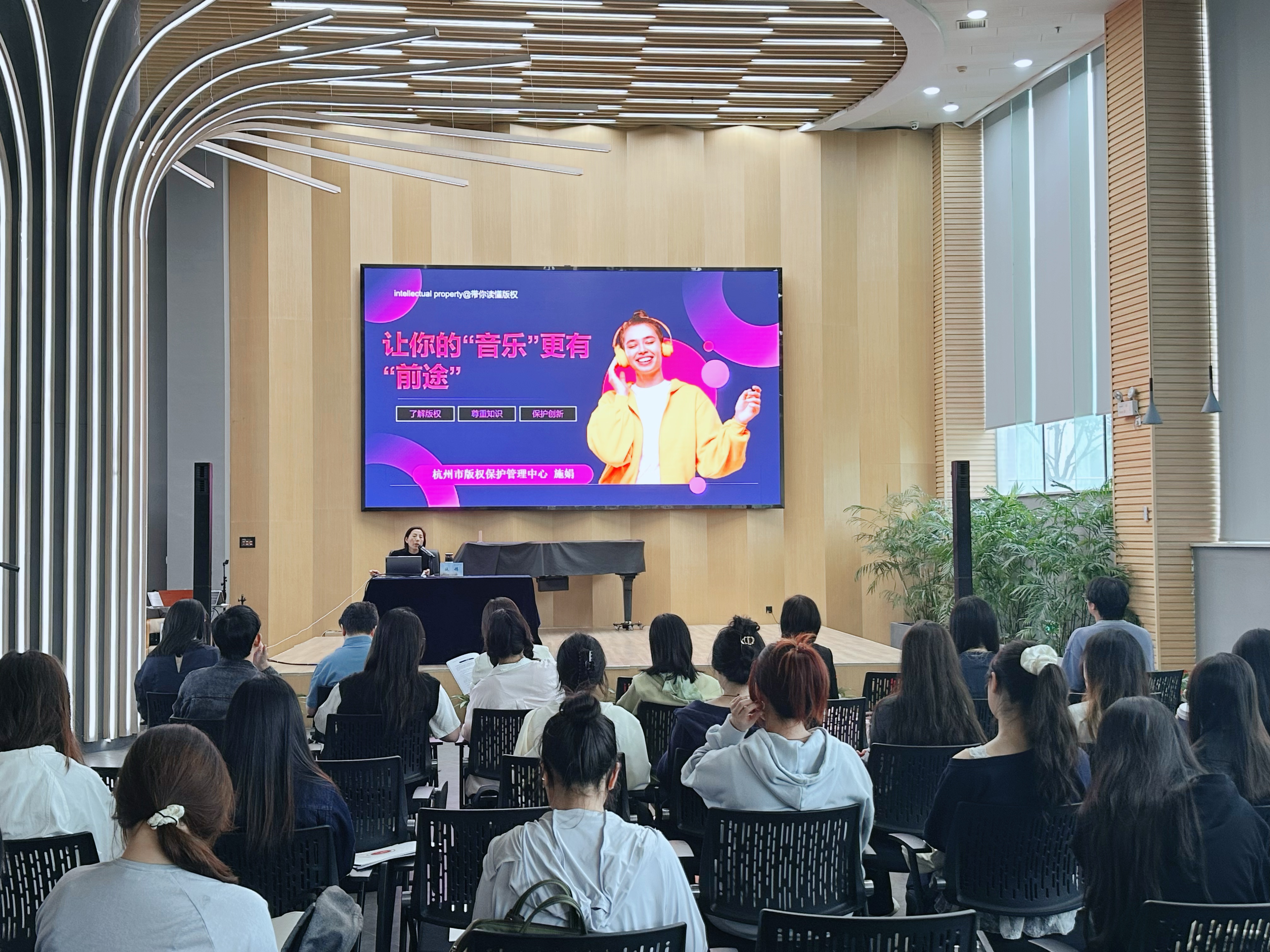 本次讲座特别邀请杭州市版权保护管理中心主任、杭州市版权保护与产业发展促进会会长、杭州市版权纠纷调解专业委员会副主任施娟主讲。她以丰富的行业经验和深厚的法律功底,结合《中华人民共和国著作权法》等相关法律法规,从一系列真实的音乐版权纠纷案例出发,围绕知识产权制度及其商业价值、知识产权基本概念、知识产权侵权风险防范三大领域进行了详细而生动的讲解。讲解既丰富有趣又贴近音乐专业师生的实际,还提供了大量实用的知识产权保护渠道和操作指南,使得抽象复杂的法律知识变得易于理解。现场气氛热烈,同学们积极参与互动,表现出极高的学习热情。