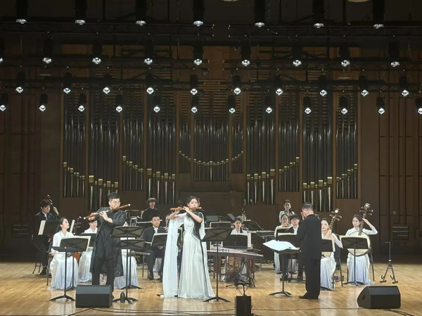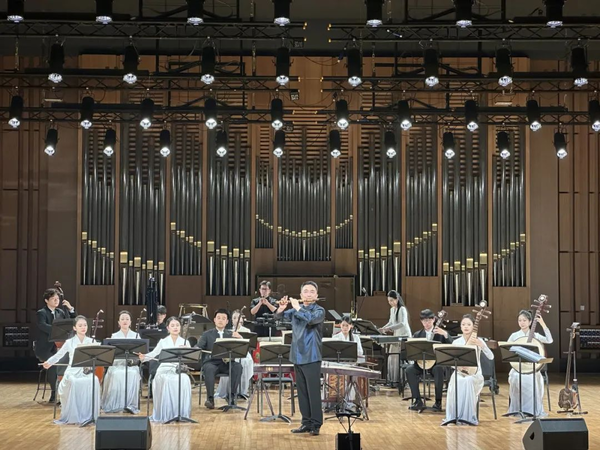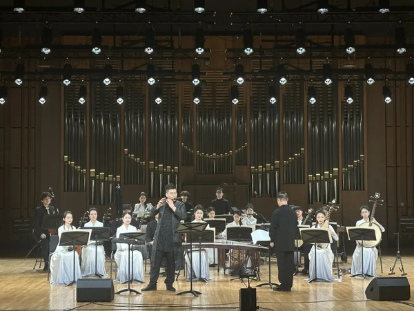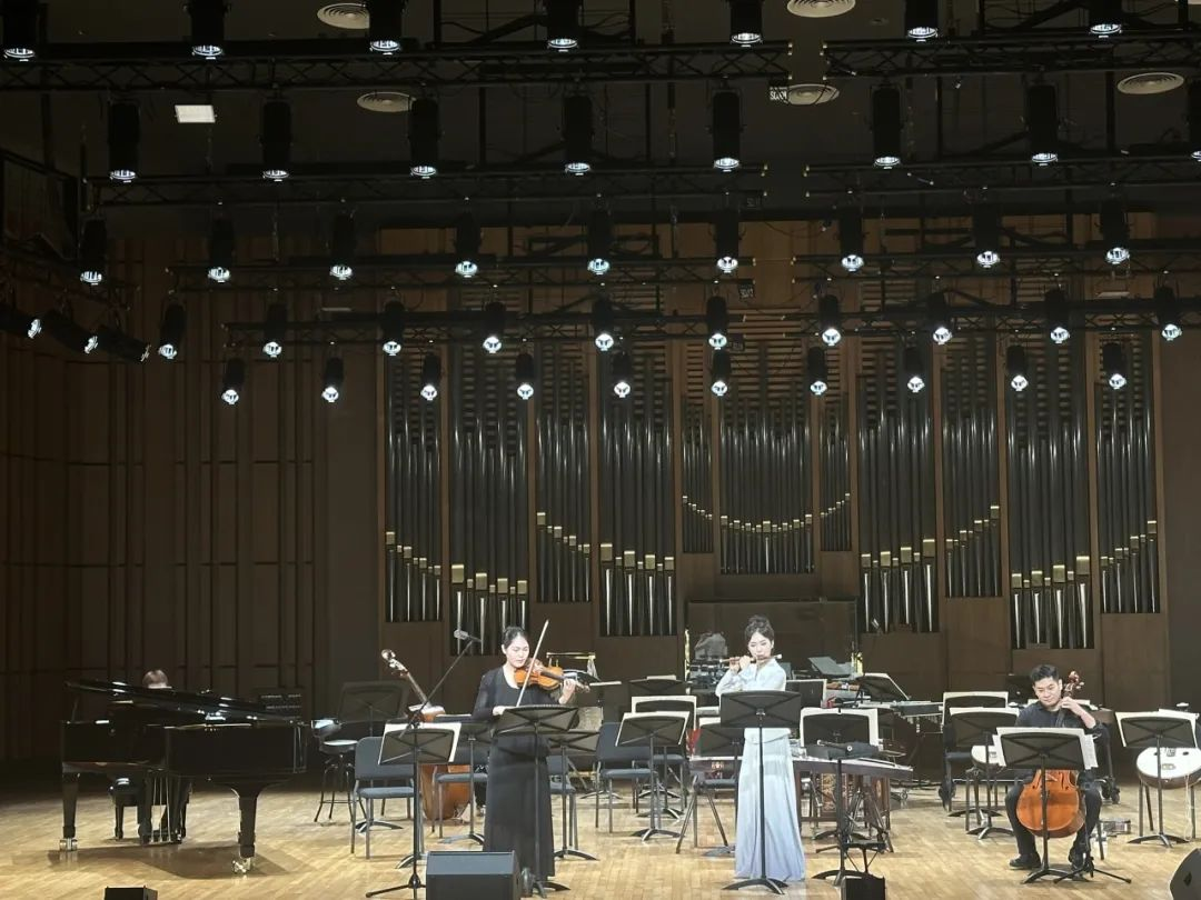 赵琦再度登台,独奏俞逊发的遗作《琅琊神韵》,击音与哨笛双音等技法的运用,将琅琊山的玄妙之境展现得淋漓尽致。终曲《幽兰逢春》由乐团全体奏响,作品以昆曲音乐为创作素材,在保留传统戏曲韵味的同时,通过现代编配手法赋予其新的艺术生命。这首充满诗意的终曲,为整场音乐会画上了意蕴深远的句点。
