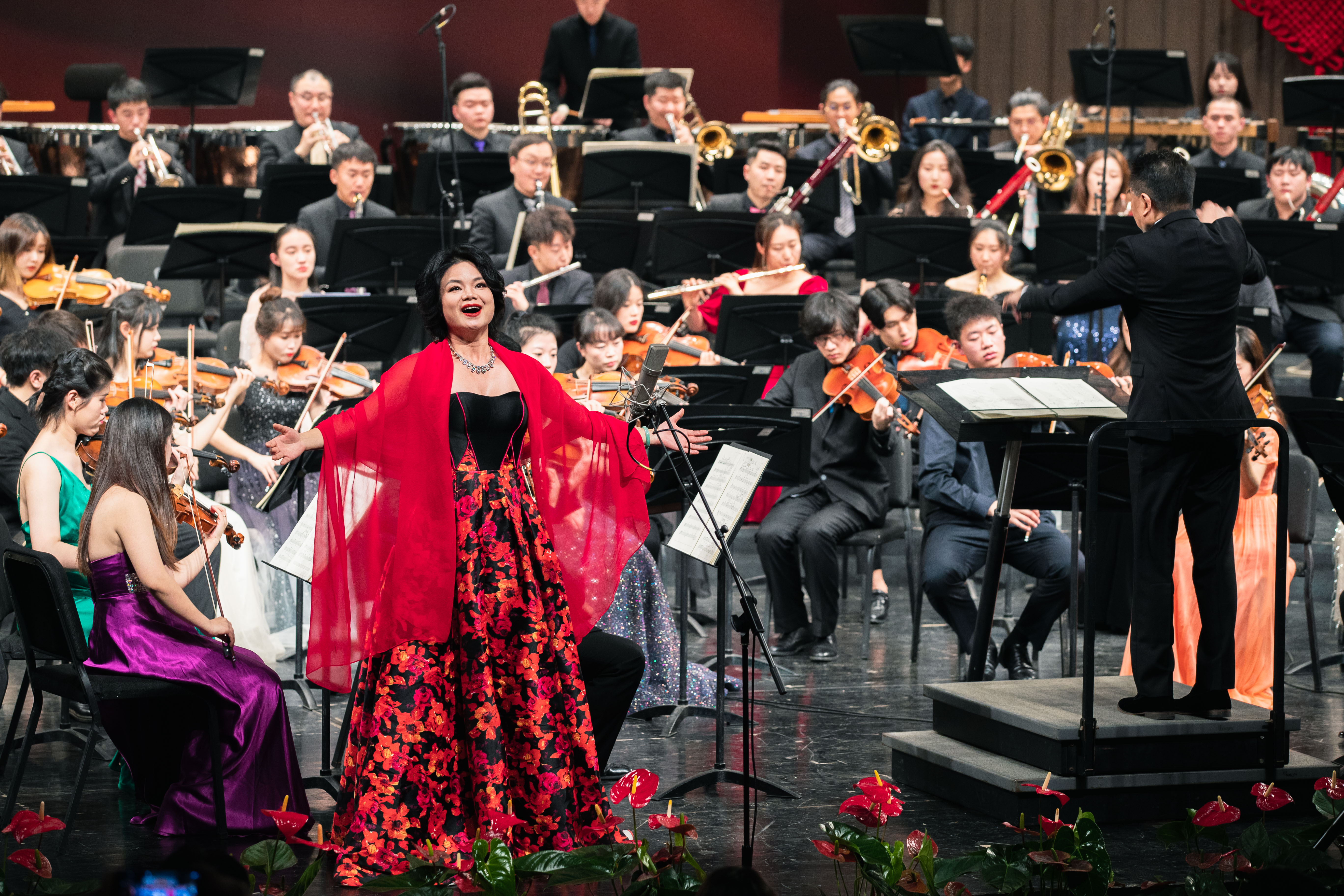 下半场,一首《节日序曲》的美妙乐声响起,胡咏言挥棒间热情澎湃,引领交响乐团精准无暇的演奏,把当晚音乐会再次燃起高潮。青年女高音歌唱家黄玮演唱《我爱你中国》,她用隽永的艺术魅力撼动着在场观众的听觉,在激情燃烧的岁月里幻醒观众最深处的感动。紧接着,交响乐团还演奏了柴可夫斯基抒情华丽的《花之圆舞曲》,马斯卡尼豪放热情的《间奏曲》和约翰·施特劳斯醉人心脾的《蓝色多瑙河圆舞曲》,默契的配合,精彩的演绎将交响乐的浪漫唯美展现得淋漓尽致。音乐会以我国著名作曲家吕其明创作的交响诗《红旗颂》收尾,耳熟能详的音乐激励着广大人民昂首阔步,迈向“十四五”新征程。一曲终了,观众雷鸣般的掌声经久不息。乐团一连加演了《我和我的祖国》《拉德茨基进行曲》2首经典作品,伴随着全体观众默契配合,击掌相合,2021新年交响音乐会完美落幕。