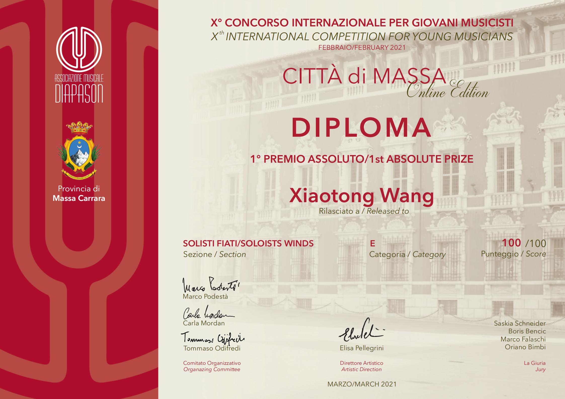 据悉,马萨第十届国际青年音乐家比赛由Diapason国际音乐家协会与马萨省政府联合举办,旨在发掘青年演奏家的音乐天分,通过比赛不断提升其专业演奏水准。评委由来自意大利、美国、德国、法国、斯洛文尼亚等多个国家的优秀演奏家组成。