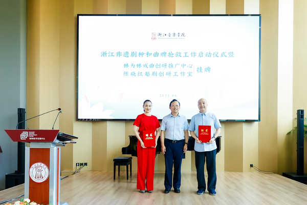 浙江作为戏曲大省,拥有丰富的戏曲非遗剧种资源,以其独有的美学品格在浙江文化遗产中占据重要地位。然而,浙江部分非遗剧种尤其是曲牌,随着老艺人的离世、传承人群断档等原因,面临着流失风险,迫切需要进行抢救性保护。为此,省文化和旅游厅主动发起了抢救曲牌、传承非遗戏曲的时代重任,通过数字化等手段,建设全省传统剧种曲牌库。6月23日,浙江非遗剧种和曲牌抢救工作启动仪式暨林为林戏曲创研推广中心、陈晓红越剧创研工作室挂牌仪式在学院举行。省文化和旅游厅厅长褚子育,学院党委书记胡建新、院长王瑞、党委副书记贾秀英,以及国家一级演员、浙江艺术职业学院特聘教授杨小青等20余位有关领导和戏曲名家出席活动。