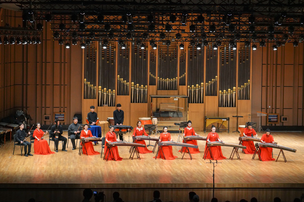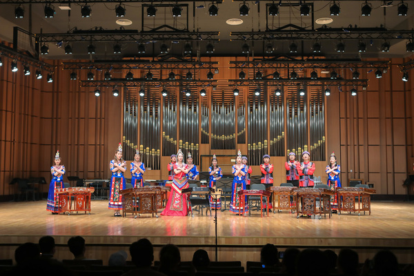 本场音乐会由国乐系主任、民族乐队学院艺术总监王甫建教授主持。作曲与指挥系副教授王云飞创作的古筝重奏《激情跨越》为本场音乐会拉开帷幕,展现了当代青年满怀信心、跨越时代、走向美好未来的激情。第二首是由弦乐声部带来的《良宵》,将100年前刘天华创作的二胡独奏曲改编为更丰富多维的重奏版本,抒发了对良辰美景的感受和愉悦的心情。第三首阮重奏《恣意放歌》通过跳跃的音符,恣意表达着人们的不同情绪。以“既和且平,依我磬声”为标题的第四首管乐和打击乐声部的展示,节奏复杂多变、音色交替重叠,很有创意。第五首乐曲琵琶声部《梦入江南》,将江苏民歌温婉的曲调与琵琶灵动的音色和丰富的演奏技法相结合,尽显“上有天堂、下有苏杭”的美好景致。第六首由弦乐声部呈现了王云飞创作的《远思》,以拉弦乐器缠绵的音色来表达遥远而割舍不断的思念。第七首是扬琴声部的《山哈》,也是全场唯一一首少数民族风格的乐曲,同学们盛装出场,把这首王云飞创作的极富动感、展现畲族风情的乐曲表现得非常精彩。最后是打击乐声部呈现的中国鼓乐《龙腾虎跃》,这首单音色皮革类乐器演奏,鼓声雄浑、节奏奔放,将本场音乐会推向高潮。7个不同声部、8首风格迥异的民族器乐重奏作品精彩上演,可谓七律谐韵、八音齐鸣。