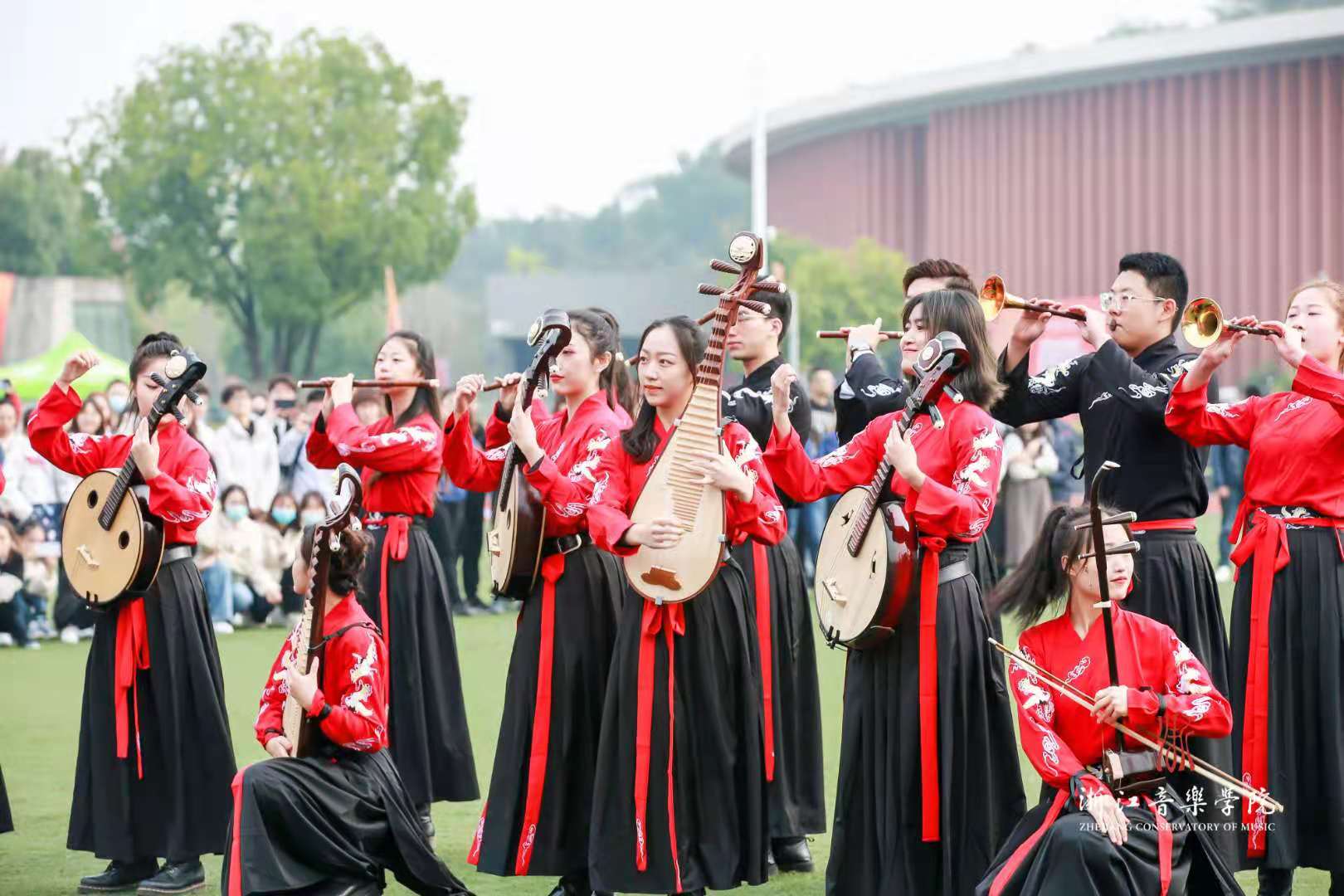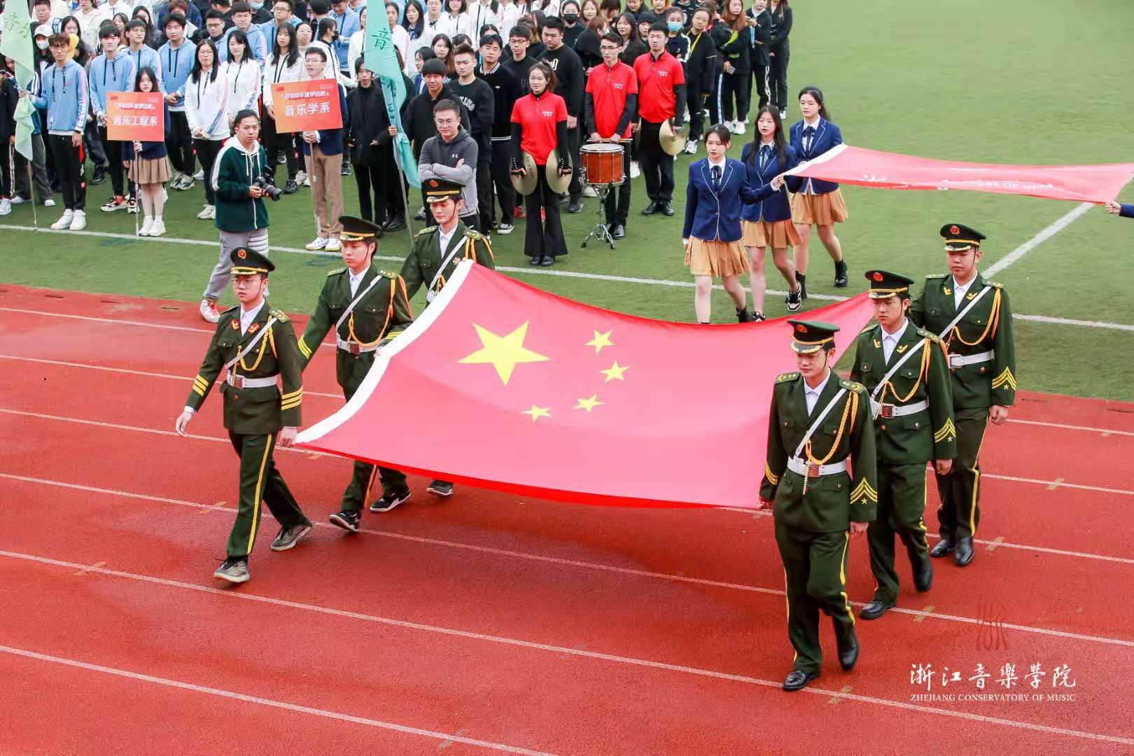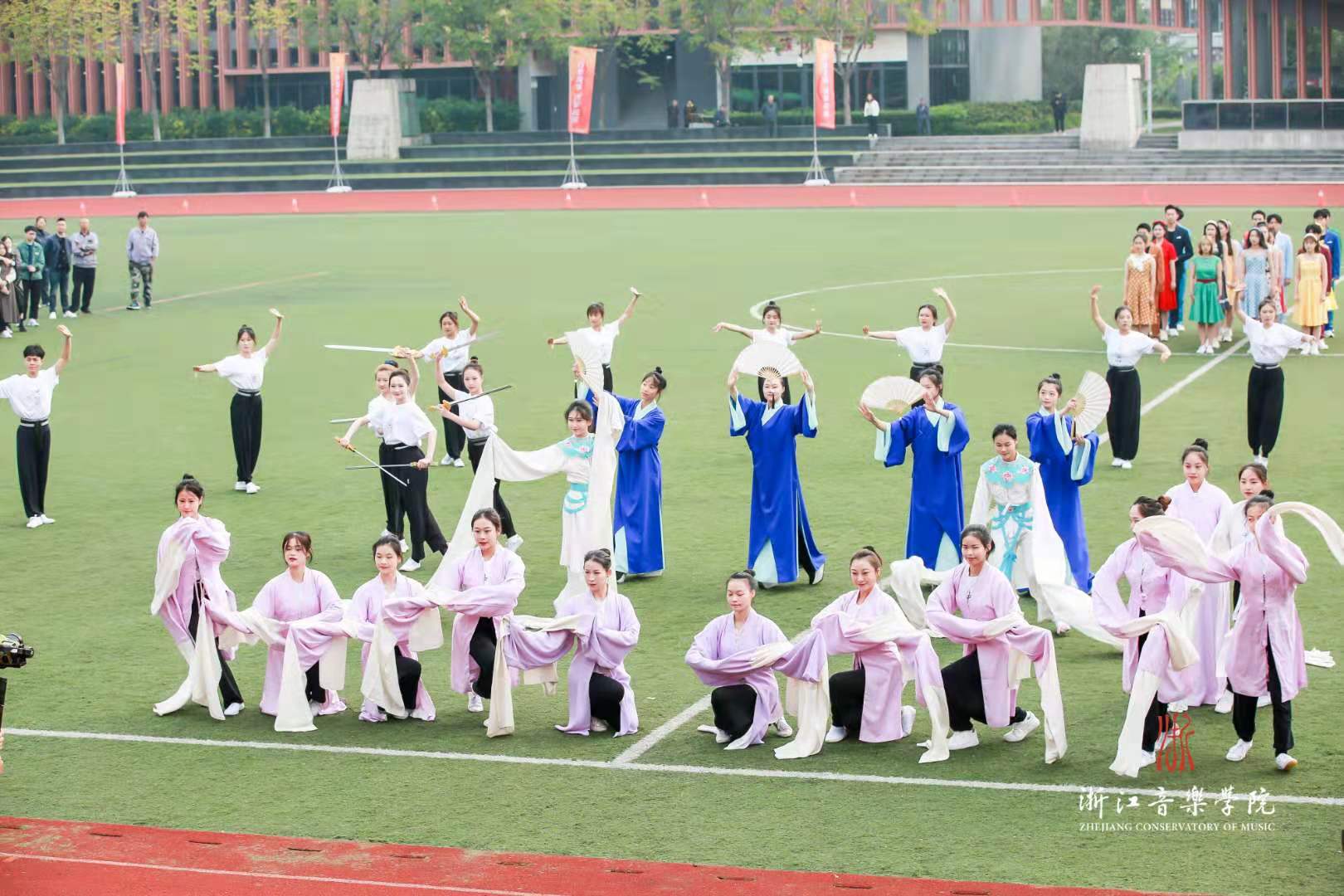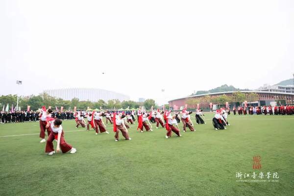 开幕式表演中,交响管乐团演奏了热烈欢快的《康康进行曲》,舞蹈学院用优美的肢体语言描绘了《信仰的红》,国乐系以合奏《国风骁勇》展现当代青年的民族自信,戏剧系将传统与现代、东方与西方艺术有机融合,表演了戏曲形体表演《粉墨铿锵》和音乐剧片段《the nicest kids in town》。活力四射的浙音学子,以音乐与舞蹈的独特魅力,拉开了本届运动会的序幕。