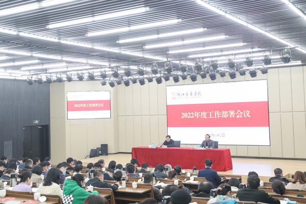 王瑞回顾和总结了2021年学院工作,同时统筹部署2022年各项任务。他指出,2021年,全校师生员工在学院党委的坚强领导下,紧盯“高水平一流”办学目标,以党建为引领,以创新促改革,以改革谋发展,学院办学水平日益提升,办学成效日益显现,办学声誉日益扩大,在立德树人、科研创作表演、开放办学、内部治理、全面从严治党等诸多方面取得了系列新的标志性成果。他表示,2022年是学院全面落实“十四五”发展规划,加快推进“高水平一流”音乐学院建设的关键之年。新一年,学院要以“十四五”规划的贯彻落实为主线,以省委巡视和审计整改为契机,以数字化改革为牵引,全面推进学院各项工作再上一个新台阶。一要系统构建浙音特色人才培养体系,系统构建“大思政”工作格局,持续深化本科教学改革,加快推进研究生教育改革。二要不断提升学科建设、科研创作和艺术实践水平,全面加强一流学科建设,加快构建现代大学学术科研机制,全面提升艺术创作与表演水平。三要深入实施人才强校战略,推出各类人才工程项目,持续深化教师分类评价改革,加强对外聘教师、柔性聘用人员和编外用工管理。四要坚持开放办学,积极拓展国际交流合作新渠道、着力提高社会合作与服务水平。五要加快构建现代大学治理体系,尽快修订学术委员会章程,深化推进“最多跑一次”改革和制度“废改立”工作,大力推进智慧化校园建设,强化服务保障。六要坚持党对高校的领导,不断加强政治建设,全面提升基层党建工作质量,扎实做好宣传思想和意识形态工作,全面深化“清廉浙音”建设。此外,王瑞还就全面完成省委巡视和审计反馈问题整改、高质量通过教育部本科教学工作合格评估、扎实推进附属音乐学校转设、慎终如始抓好常态化疫情防控等重点专项任务作出部署。