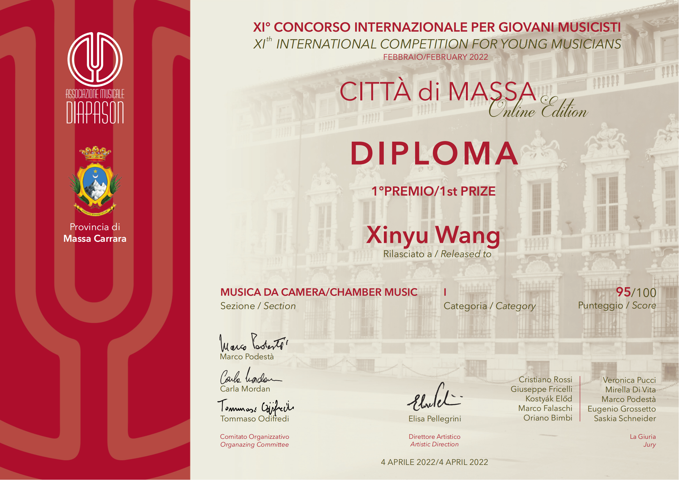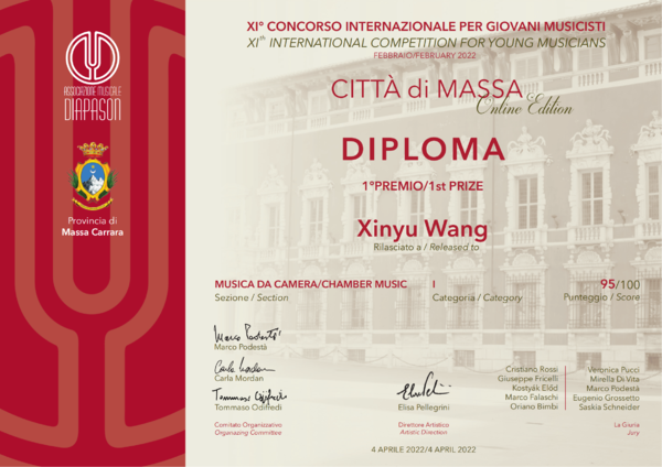 据悉,马萨第十一届国际青年音乐家比赛由Diapason国际音乐家协会与意大利马萨省政府联合举办,评委由多个国家的优秀演奏家组成,旨在发掘青年演奏家的音乐天分,通过比赛不断提升其专业演奏水准。