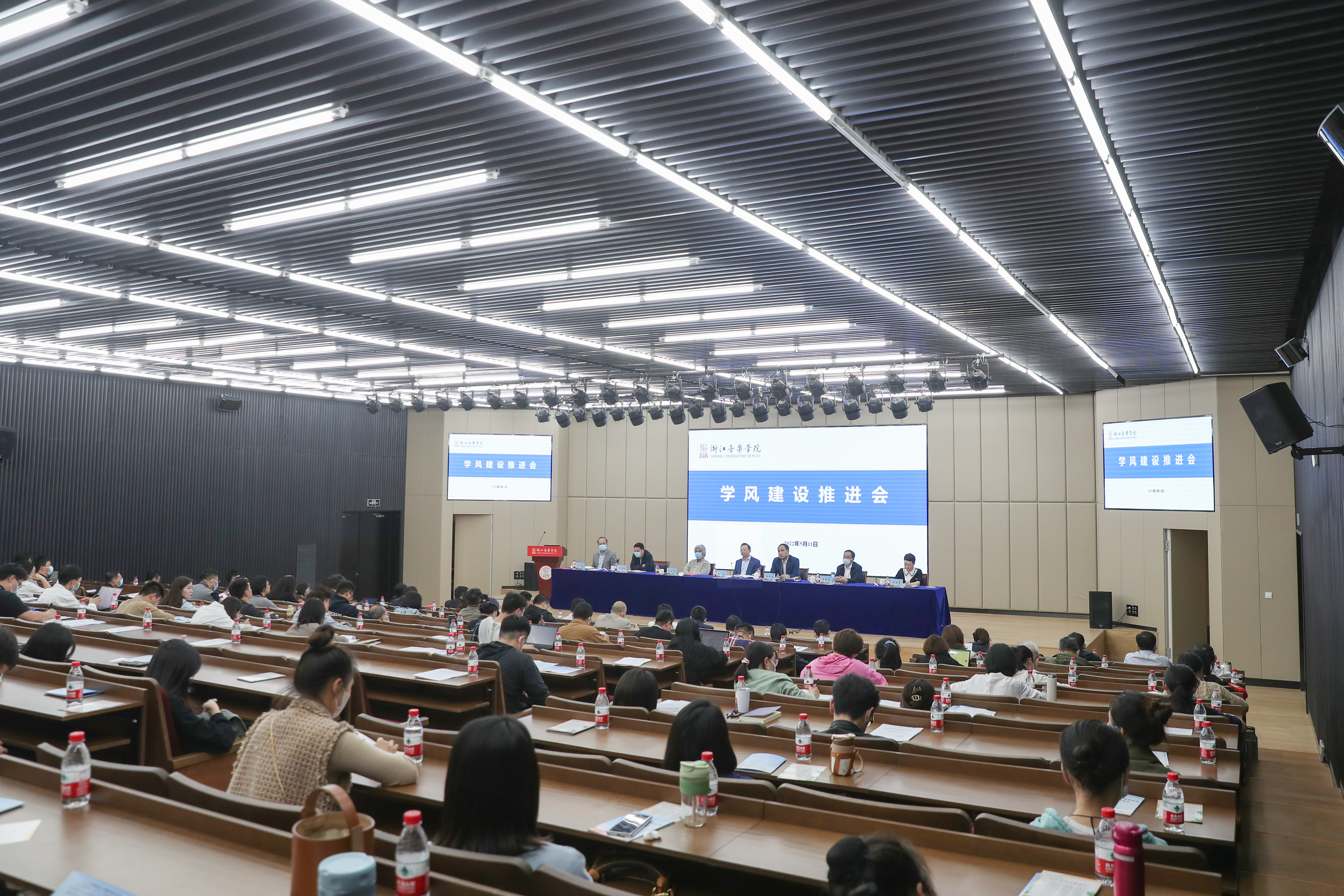 院长王瑞在大会上作了题为“激发内在动力、建立长效机制,努力建设浙音特色的优良学风新面貌”的讲话。他充分肯定了建校以来各单位在推进学风建设的制度保障、教育教学的系列改革、艺术实践的品牌培育等方面取得的成绩。他指出,学风是校风、教风、师德师风的本质反映,是办学理念和办学水平的充分彰显,良好学风是高水平大学的共有品质与特征。推进学风建设是“十四五”内涵发展的重要内容,也是推进高水平一流音乐学院建设的必然要求,召开学风建设大会是对学院建校以来学风建设工作的一次及时总结和系统梳理,更是对下一阶段良好学风建设的全面部署与动员。王瑞强调,全校上下要在思想上高度重视、认识上高度统一,深入贯彻落实习近平总书记关于教育的重要论述,全面落实上级部门关于教育教学改革的决策部署,客观分析当前学风现状和存在问题,探索激发学风建设内在动力的有效方式,将学风建设作为增强核心竞争力,实现后发先至、后来居上的重要路径选择。要敢于抓学风、善于抓学风,以学风建设推动教育教学、管理服务的系列变革,将学风建设的成效体现在学院发展的方方面面。要强化落实、形成合力,提升学风建设的系统性、有效性,将学风建设作为单位考核和教师考核的重要内容,以定量为主、定性为辅,不断完善学风建设的长效机制。最后,他指出,学风建设是一项持久性的系统工程,需要我们始终坚持以学生为中心、以教师为主体的理念,充分吸收高水平一流高校的先进经验,葆有信心、耐心、恒心和包容心,久久为功、常抓不懈,全面助推高水平一流音乐学院建设,以优异成绩迎接党的二十大胜利召开。