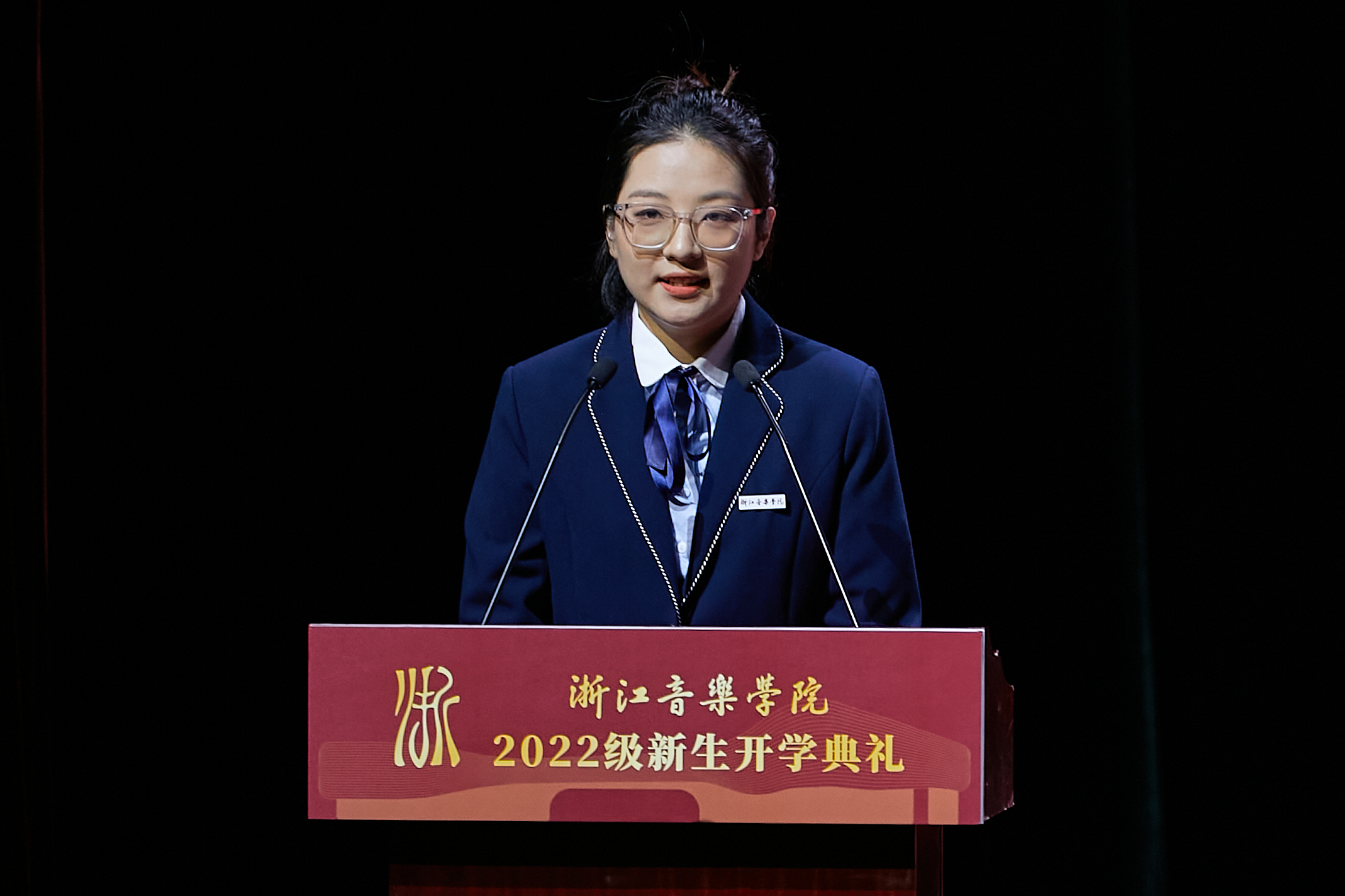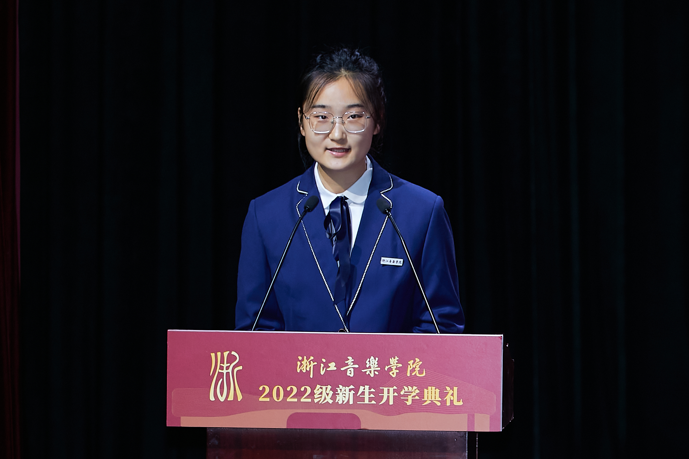 管弦系崔凤兰代表本科新生发言。她动情表达了初入校园的复杂心情和对师长们引导关怀的敬意感谢,并表示,要树立清晰目标并为此坚持不懈,有所为,有所不为,怀着谦虚好学的态度在浙音书写出青春篇章,以优异的专业技能为桥梁,传播好中国故事,用自己的艺术梦想助力“中国梦”的实现。