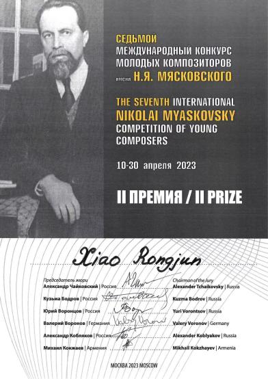 4月30日,第七届尼古拉·米亚科夫斯基青年作曲家国际比赛(International Nikolai MyaskovskyCompetition for Young Composers)在莫斯科国立柴可夫斯基音乐学院落下帷幕。作曲与指挥系本科四年级的肖荣俊(指导教师:郭鸣教授)凭借作品《Fantasy》(为弦乐队而作)获得本届比赛二等奖。