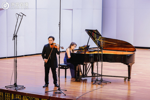 随着全场观众热烈的掌声,音乐会正式开始。本场音乐会上半场演奏的第一首作品选自瓦格纳《公主梅特涅的专辑》中的《浪漫曲》,由著名青年小提琴演奏家、中央音乐学院副教授岳麟携手钢琴演奏家史佳怡共同演绎。主题乐思在连绵的弦乐与钢琴的交错之间不断展开、此起彼伏,让观众感受到瓦格纳的浪漫思绪以及对情感、时间的缅怀。第二曲由“杭州四重奏”演绎贝多芬《C大调第九弦乐四重奏》(OP.59,No.3)。“杭州四重奏”由学院管弦系4位青年优秀教师、演奏家组成,致力于打造一支国际化、高水平的弦乐四重奏专业演奏团体。这部作品创作于1806年,也被称为“英雄四重奏”“拉兹莫夫斯基四重奏”。此次“杭州四重奏”对音乐的诠释张弛有度,演奏家之间的默契成为打开作品演绎的关键,各声部的配合与诉说,充满了个性与张扬、炙热与渲泄,将晚期贝多芬的执着冷静、哲理思考娓娓道来。
