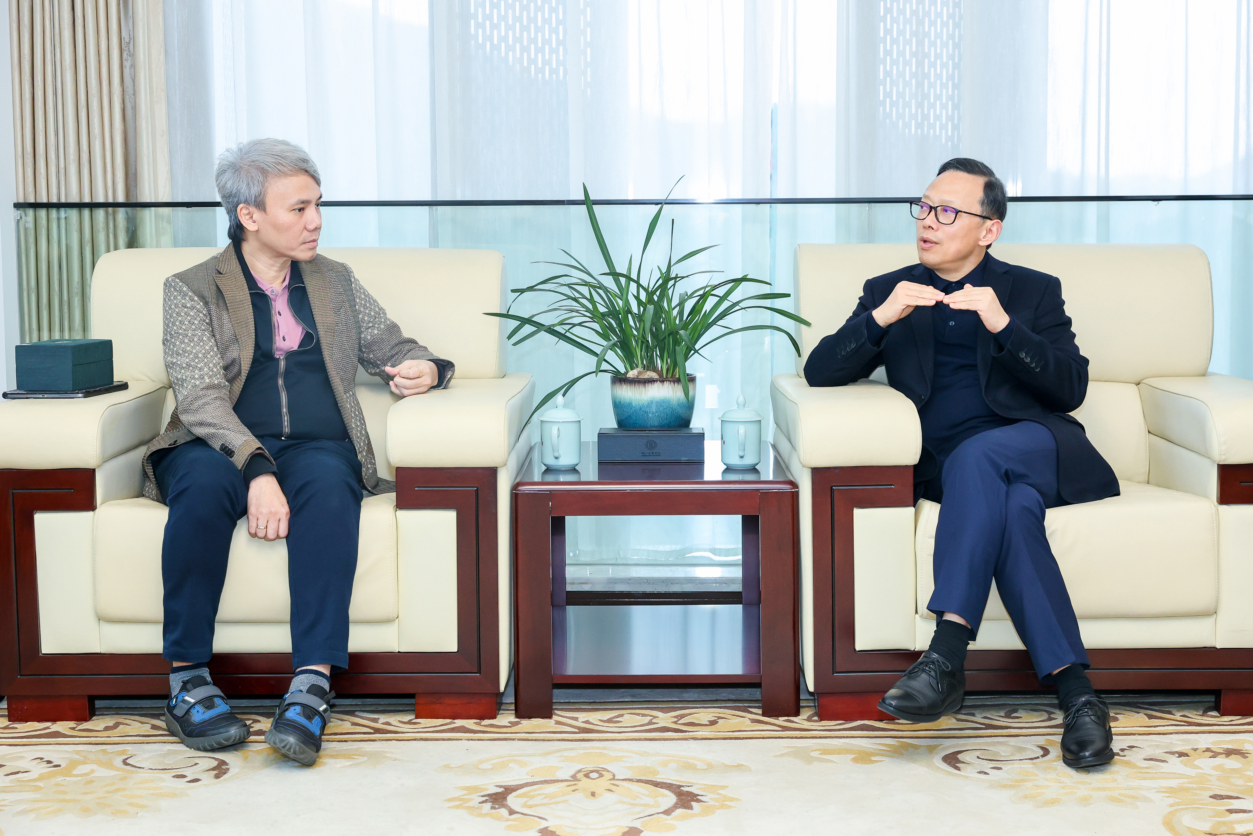 庞那荣对浙音的热情接待表示感谢,并简要介绍了玛希隆大学音乐学院的基本情况。他指出,玛希隆大学音乐学院正积极寻求开展东方音乐研究的合作资源,并对王瑞院长提出的设想表示高度赞同。浙音与玛希隆大学音乐学院都处于高速发展的关键时期,希望双方充分发挥各自专业和人才优势,实现资源共享和合作共赢。他还邀请浙音明年组团回访泰国,参加全球高等教育音乐峰会,进一步深化两校间的学术交流合作。