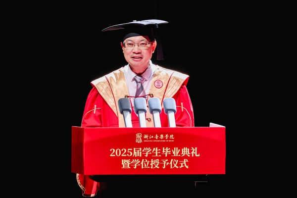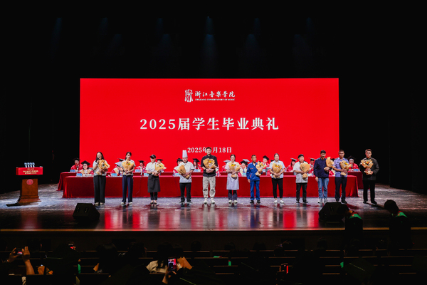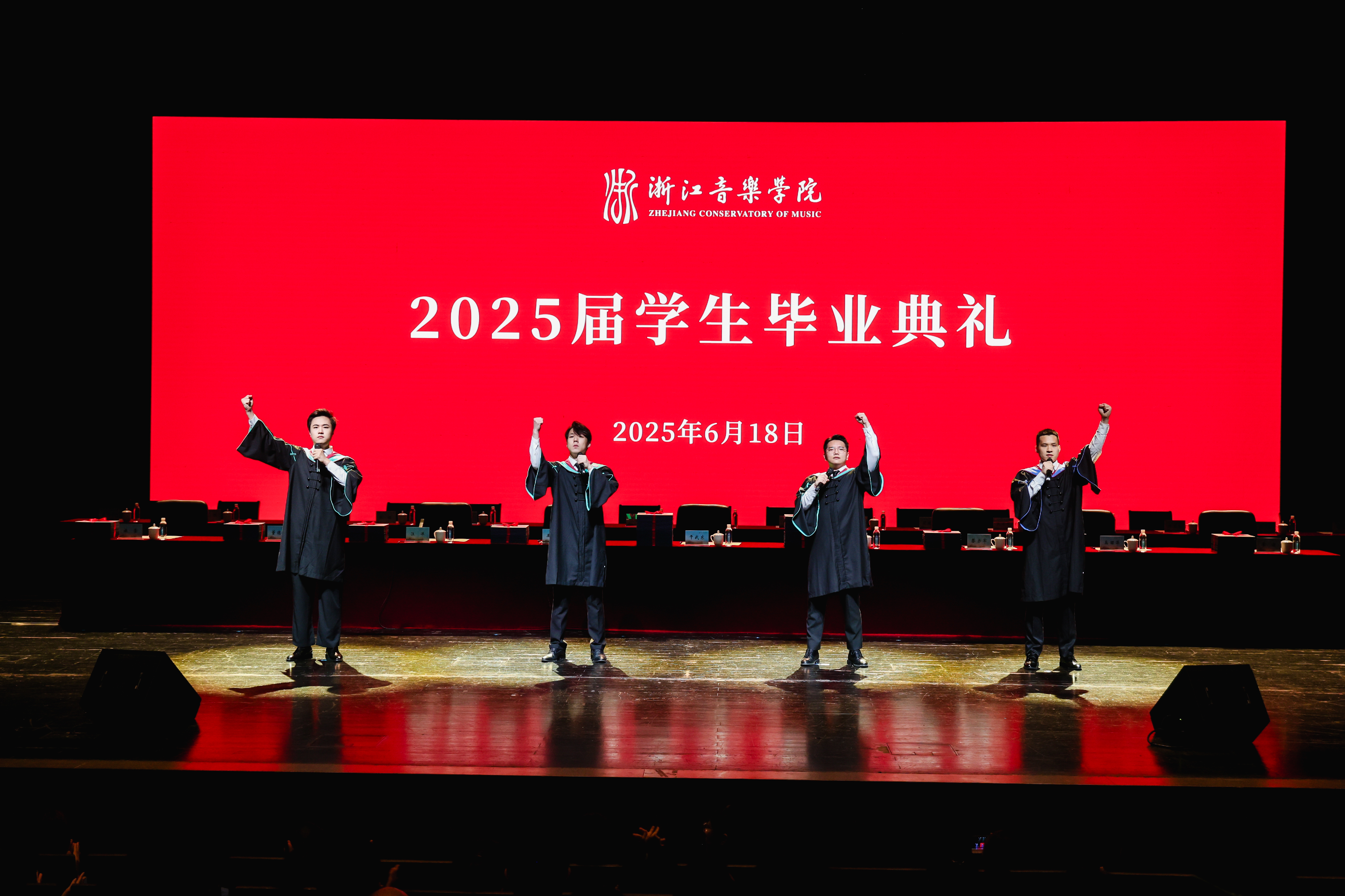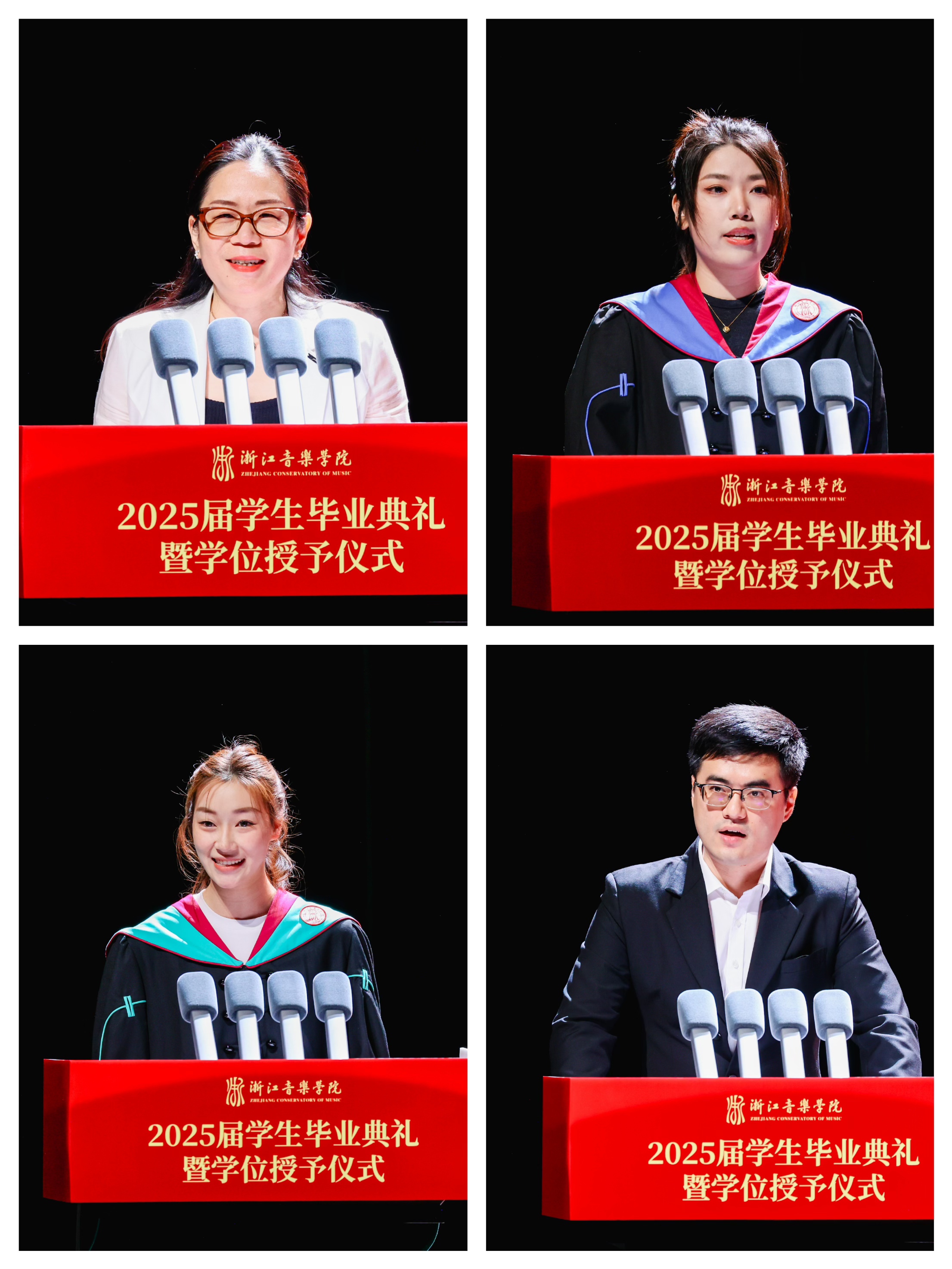 钢琴系徐洁代表教师发言,她细数四载春秋里与浙音学子们朝夕相处的动人点滴,希望同学们擎理想、守责任、融热爱、持坚韧、秉创新、倾真诚、怀感恩,带着“弘毅、尚德、博约、精艺”的浙音精神,在人生海洋中乘风破浪。艺术与文化管理高等研究院刘雨欣、舞蹈学院余晨晞分别作为研究生、本科生毕业生代表上台发言,她们用诗意的语言表达对母校的缱绻深情,并表示将以“弄潮儿”的姿态继续谱写青春华章。作曲与指挥系毕业生单未繁作为校友代表分享自己毕业后的追梦故事,并为全体毕业生送上最衷心的祝福。