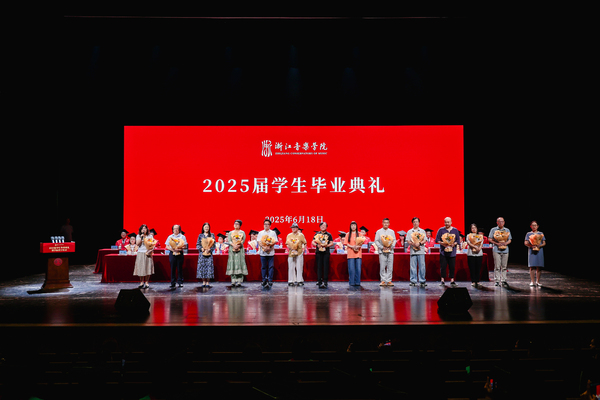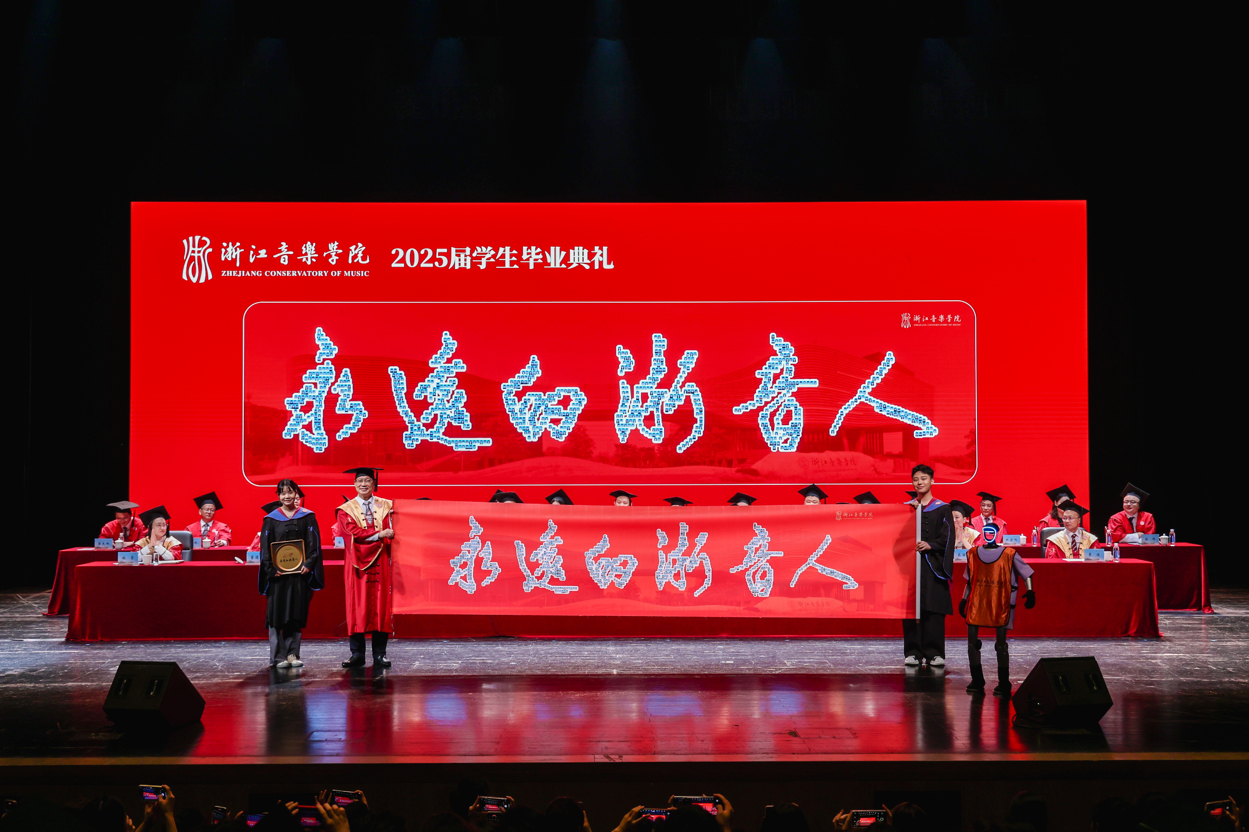 党委书记干武东向毕业生赠予亲笔题写的“永远的浙音人”纪念盘,并代表学院接受毕业生赠送的卷轴。这幅卷轴别出心裁地将全体2025届毕业生的照片巧妙拼组成“永远的浙音人”的艺术字样,既是毕业生对母校培育之恩的深情致谢,也展现了他们将以“永远的浙音人”这一崭新身份扬帆起航、追逐梦想的坚定决心。