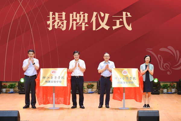 学院各职能部门、各院系党政负责人,西湖区政府党组成员、区委办、区政府办、区教育局、西湖文旅集团、艺创小镇发展服务中心、转塘街道等主要负责人,西湖第一实验学校师生代表、附中师生代表,以及相关媒体代表参加活动。
